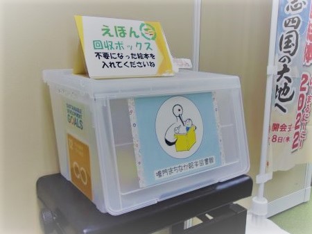2022年7月現在、鳴門市役所本庁舎や教育委員会生涯学習人権課に家庭で読み終わった絵本を再利用する「絵本回収ボックス」を設置しています。読み終わった絵本や児童書がありましたら、寄付のほどお願いいたします。
